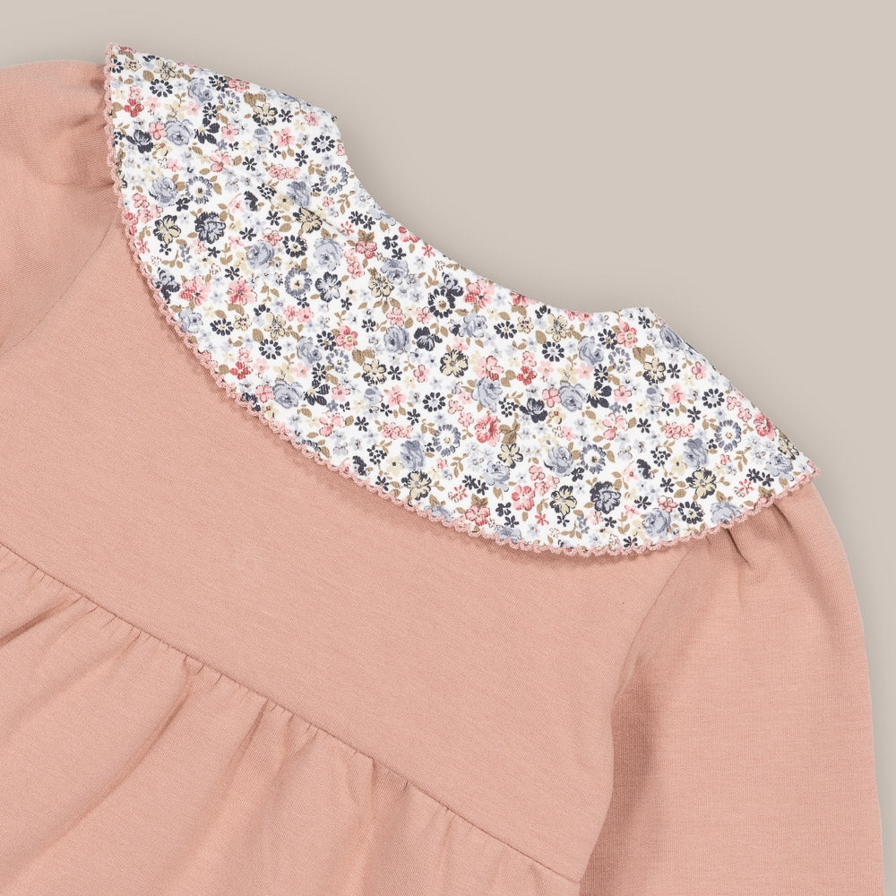 Jersey  de niña en algodón con detalle de cuello estampado y botonadura delantera,que hace una  función práctica al permitir abrochar la prenda, y aporta un estilo único a la sudadera.