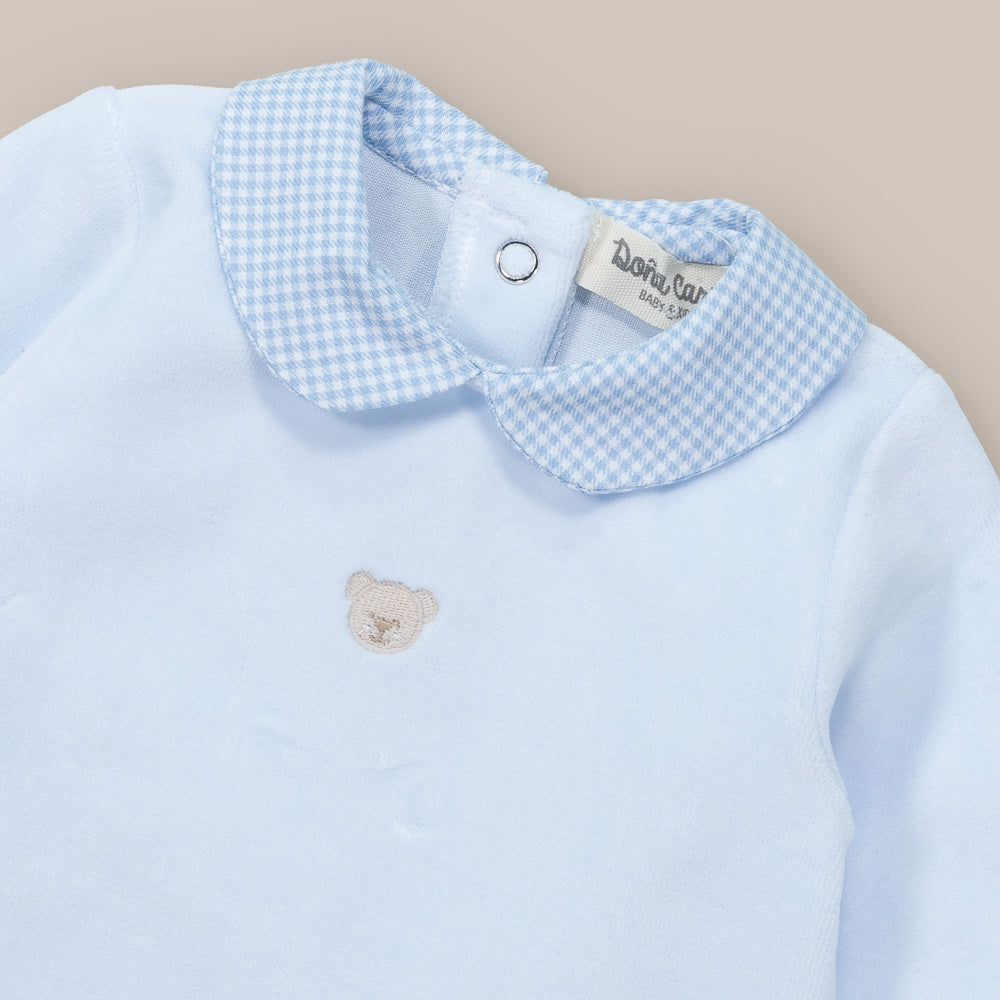 Conjunto de terciopelo largo para bebé con jersey con cuello estampado y cierre  a la espalda con botones y leggings.