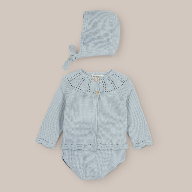 Conjunto de punto para bebé formado por chaqueta con bonitos detalles calados y botones de madera,culotte de bebé con goma en cintura y perneras, y capota a juego.