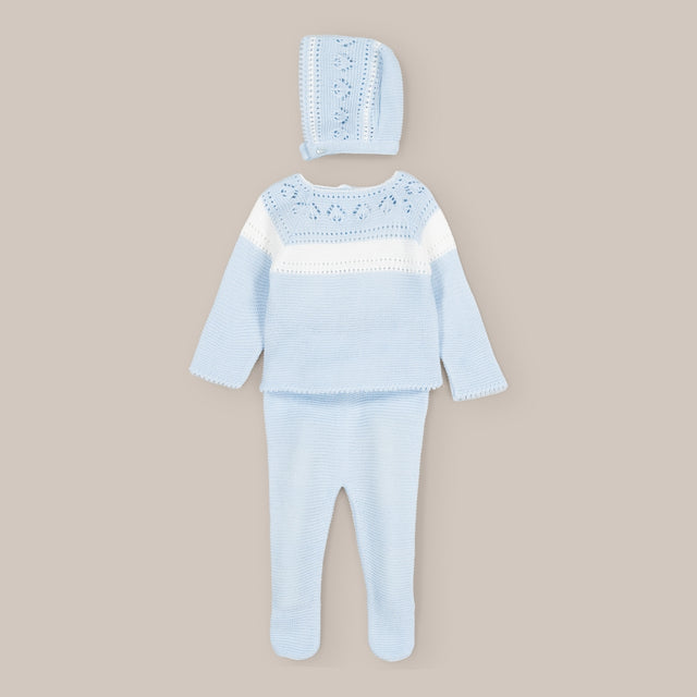 Conjunto de punto largo para bebé con jersey calado y cierre  a la espalda con botones,leggings y capota a juego.