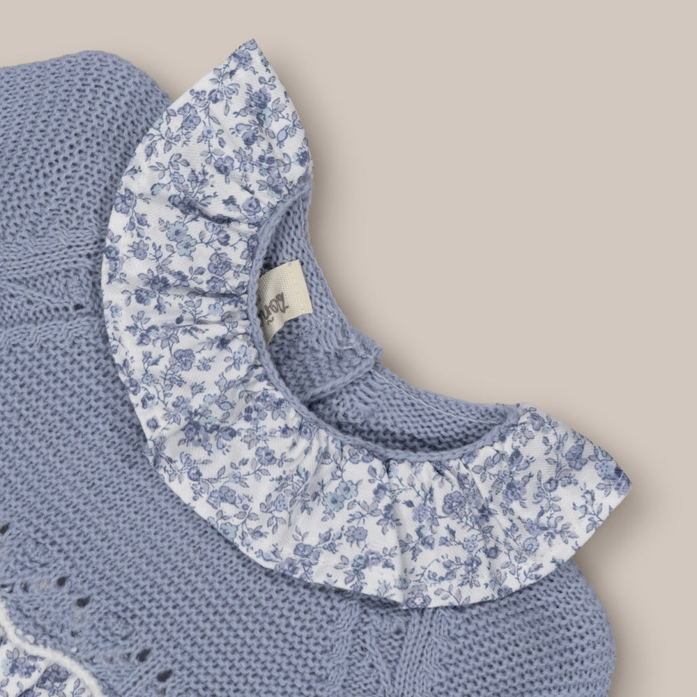 Vestido de bebé combinado de punto en pechera y falda en tela floral 100% algodón a juego con su cuello volante.Cuenta con cierre trasero y culotte a juego con goma en cintura y perneras