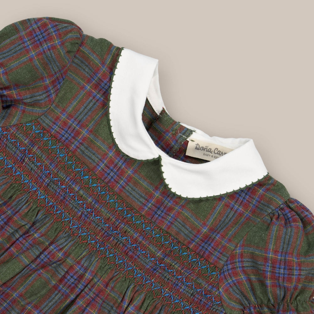 Este encantador vestido infantil de manga corta está confeccionado en tela de cuadros con forro interior de algodón, que aporta suavidad y comodidad en el día a día.