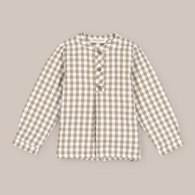 Esta camisa de niño de manga larga en tela de cuadros es perfecta para todo: desde un look informal hasta un conjunto más arreglado. Tiene cuello redondo, media botonadura frontal y puños abotonados, lo que le da ese toque entre camisa de vestir y casual que siempre viene bien.