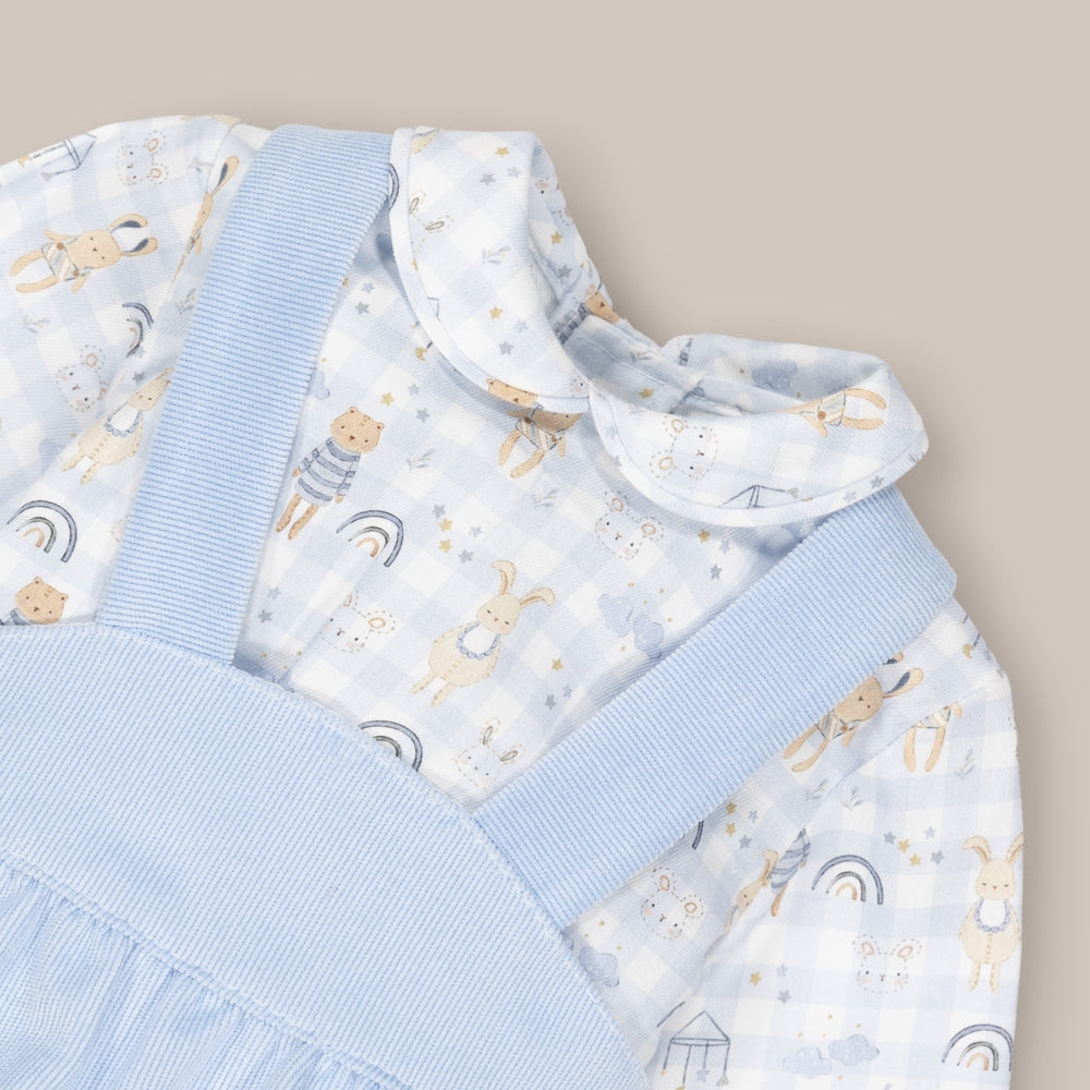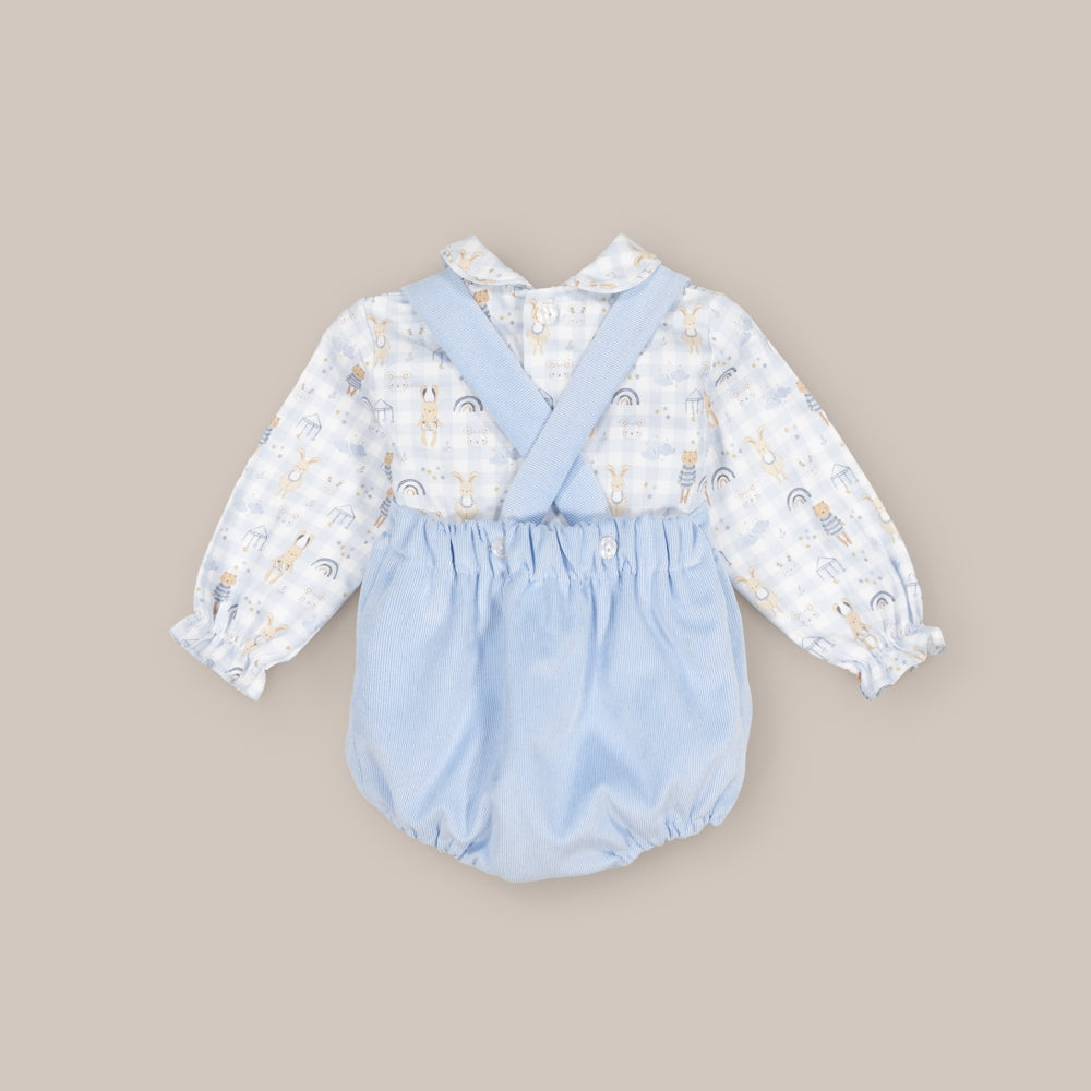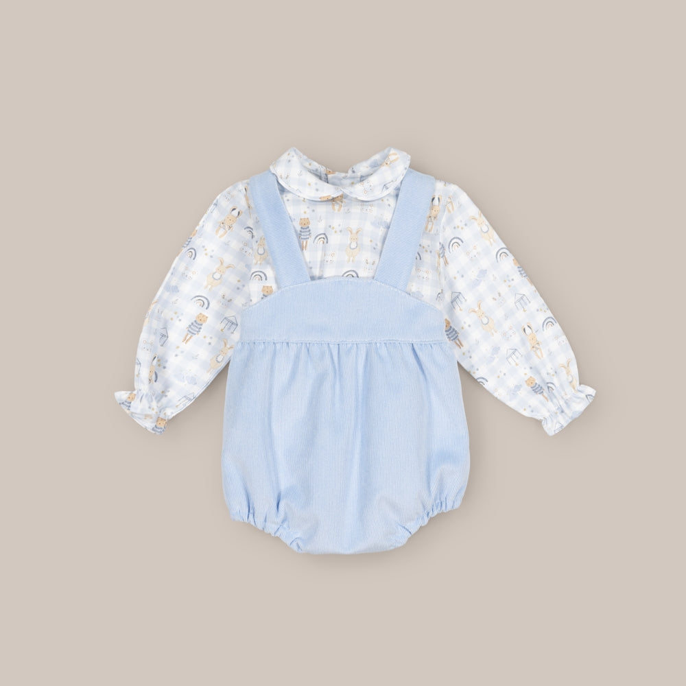 Este conjunto para bebé combina un peto con tirantes ajustables y botonadura inferior, con una camisa de algodón estampada con cuello bebé. Ideal si te gusta la ropa combinada para bebé con un toque clásico y delicado.