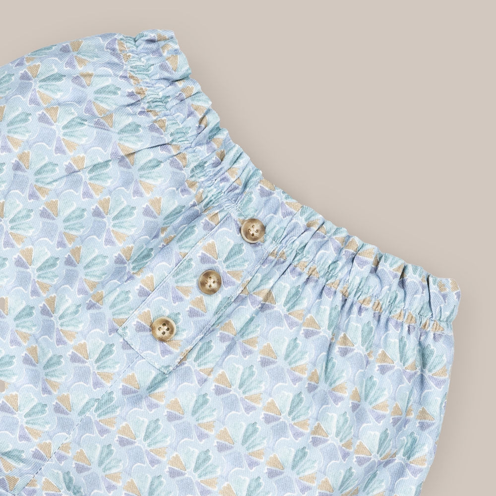 Pantalón de bebé confeccionado en tela estampada. está adornado por detalles decorativos de botones de madera .