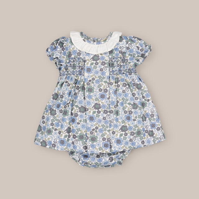 El diseño incluye botones decorativos en la parte delantera y un práctico cierre trasero para facilitar el cambio. Se completa con un culote a juego, con goma en cintura y perneras para un ajuste cómodo y seguro.