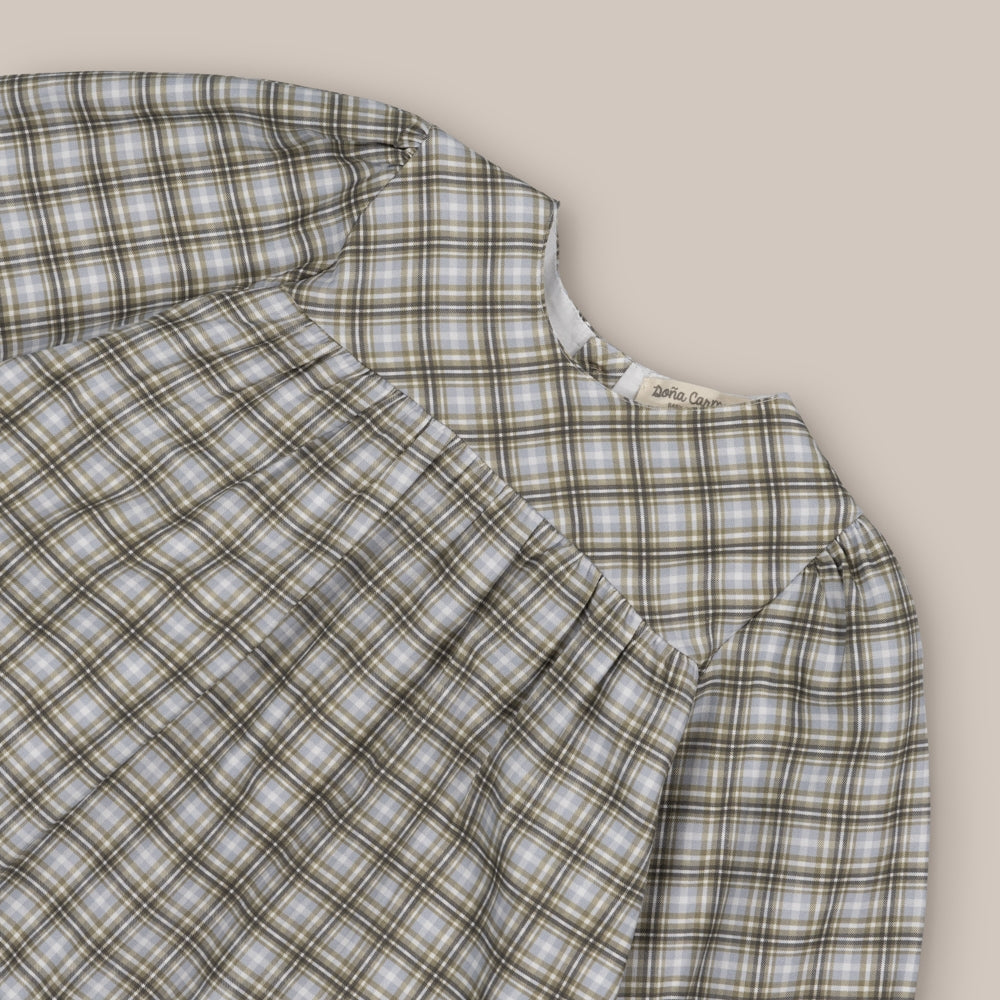 Este vestido de niña está confeccionado en bonita tela de cuadros que da un aspecto alegre y sofisticado.