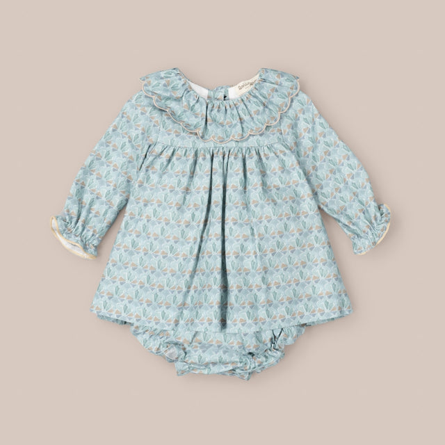 Baby dress made of printed fabric with ruffle detail. It has a back closure and matching shorts with elastic waist and legs. 100% cotton