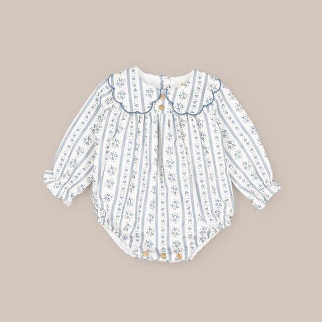 This delicate romper for baby, made of 100% cotton floral fretwork fabric, it is an essential garment within traditional newborn clothing. Its design stands out for a baby collar with a wave finish and decorative buttons on the front that provide an elegant and timeless look. To make it easier to put on, it includes back and bottom buttons, making it a practical and comfortable option for everyday use.