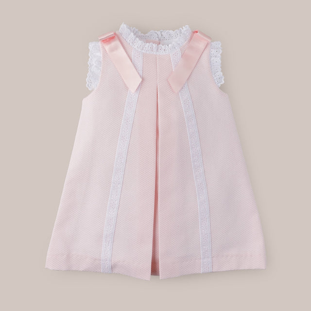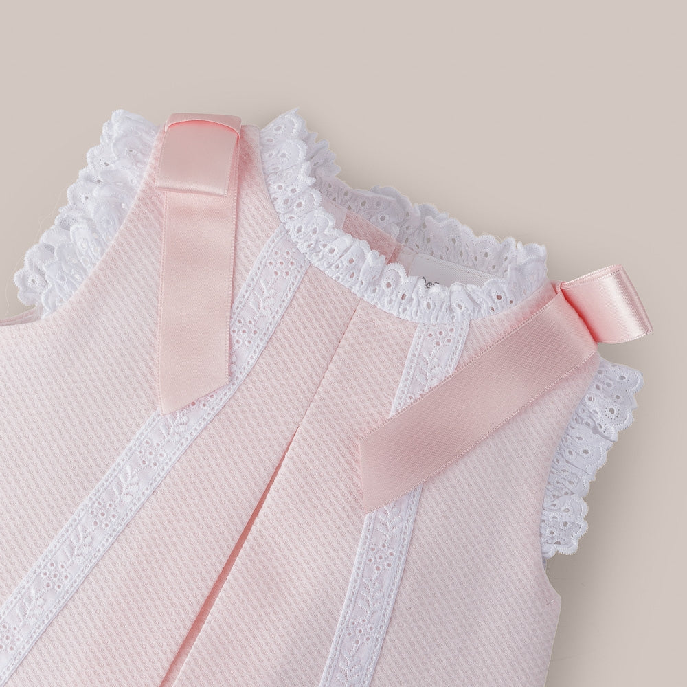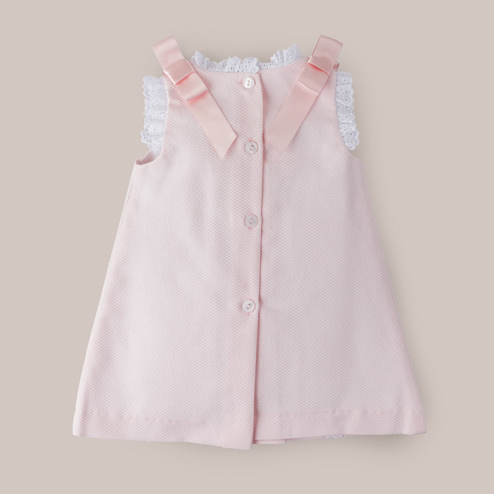 Faldón de bebé en piqué,adornado por pasacintas y lazadas al tono en los hombros . Para una puesta más cómoda cuenta con botonadura trasera.