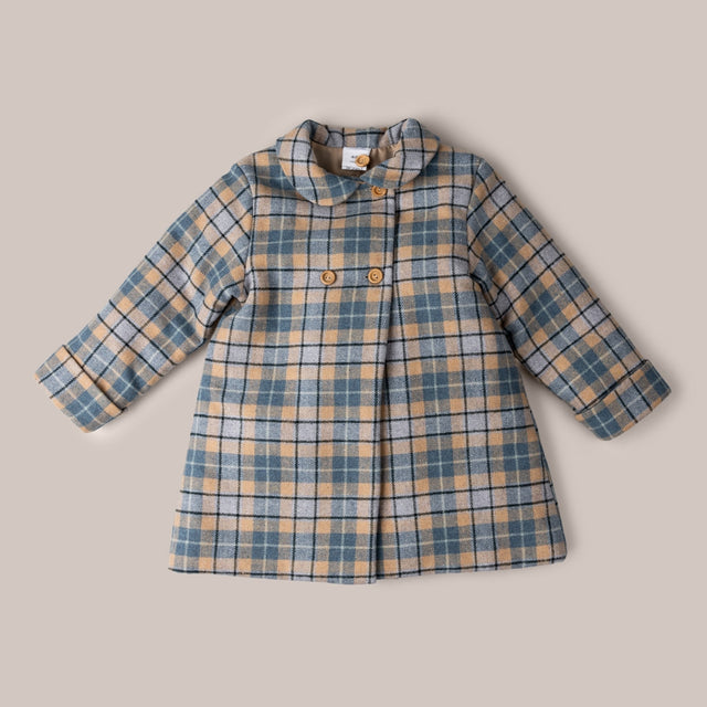 Abriguito forrado en tela de cuadros con cuello tipo bebé. Se cierra con doble botonadura delantera en madera .