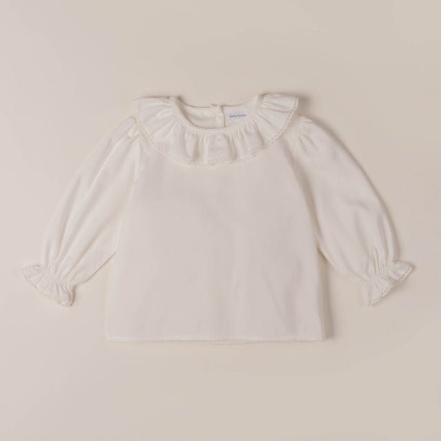 The rear button adds a practical element to the blouse, facilitating to dress and undress the girl comfortably.