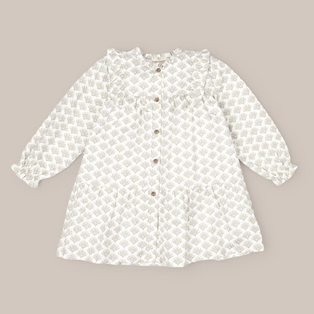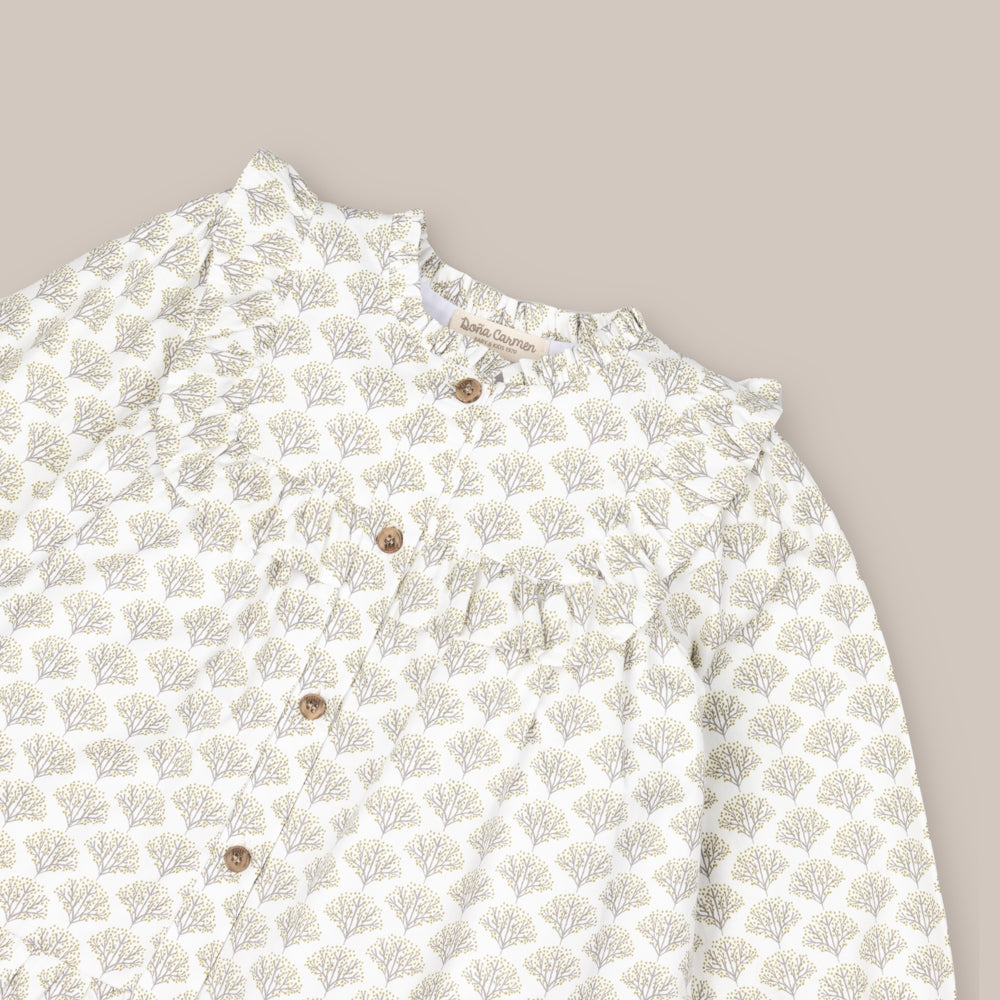 Girl's dress made of printed cotton fabric with ruffle details and front buttoning. More items from the collection available for siblings.