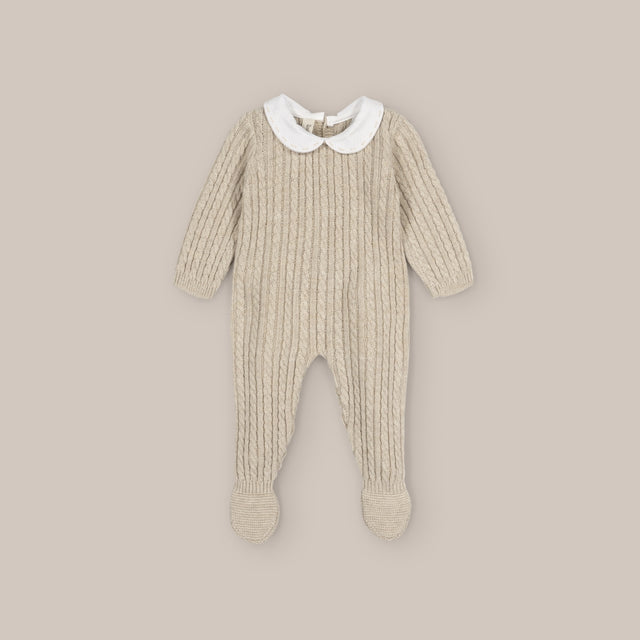 Pelele de bebé de cuerpo entero en punto con detalles de ochos y cuello bebé de piqué a contraste. Para una puesta más cómoda cuenta con botonadura trasera.