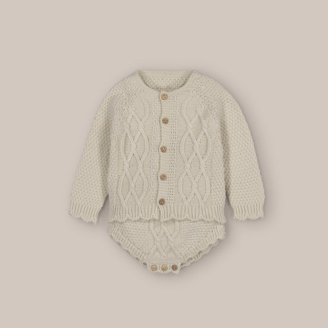Set of knit for baby formed by cardigan With beautiful details of Greece, front closure with wooden buttons, and baby culotte with gum on the waist and perneras.