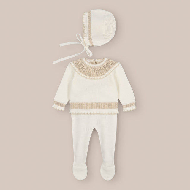 Conjunto de bebé de tres piezas: jersey, polaina y capota.