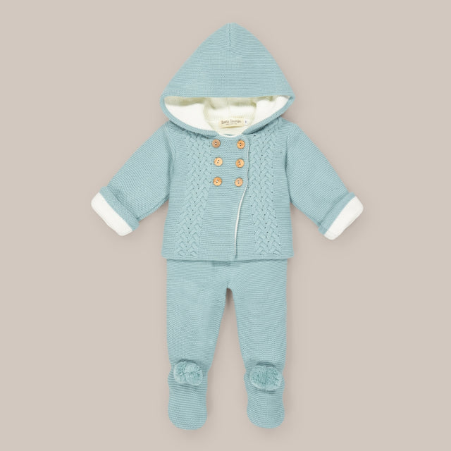 This cozy set of knit for baby is composed of a cardigan With hood, adorned with an elegant double braid in the front and double wooden button that provides a classic and artisanal touch. It is completed with a matching polaina, perfect to keep the baby sheltered from head to toe.