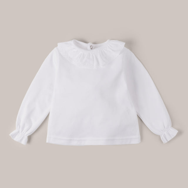Blouse made of white cotton fabric. It is adorned by a riberate flyer neck, just like sleeves. It closes in the back with square brackets. Basic essential to accompany this season's looks.