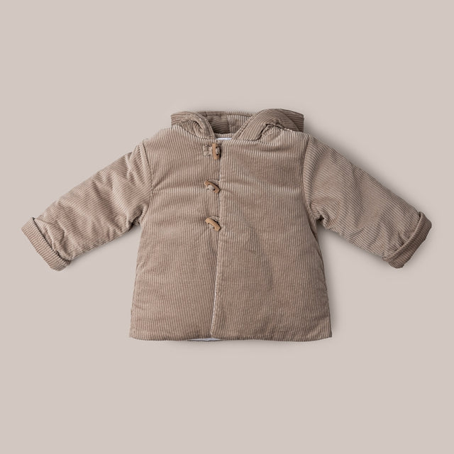 short coat padded in beige corduroy to match the rest of the pepper collection. Lined inside, it has a wooden front closure and hood.