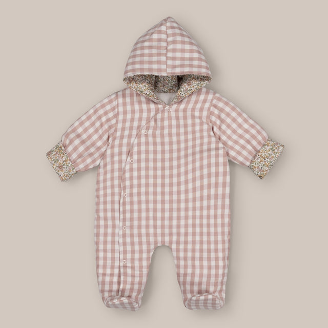 Jumpsuit for padded baby made of gingham check, with contrasting inner lining on the hood and cuffs. Side front closure with automatics.
