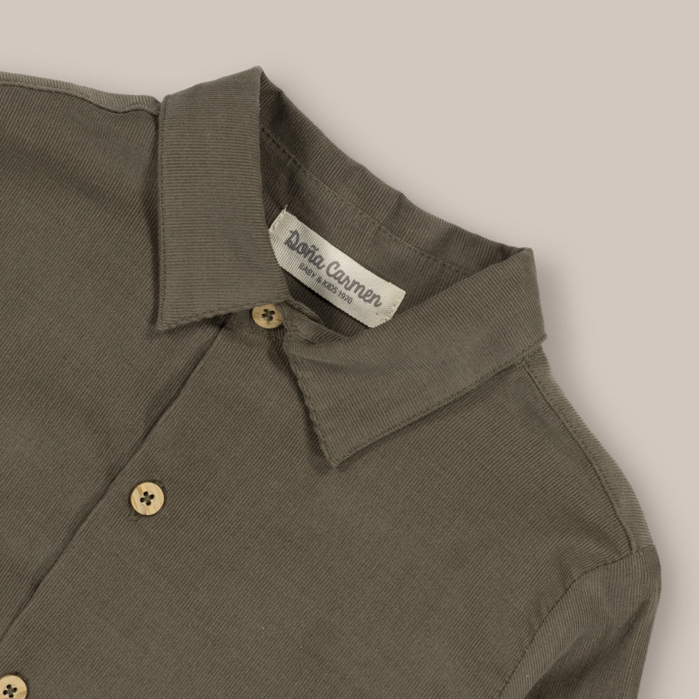 A shirt for boy long-sleeved in a beautiful seasonal green, with a classic collar and wooden buttons both on the front and on the cuffs. Ideal for those looking for dress or casual shirts with that special touch that goes with everything.