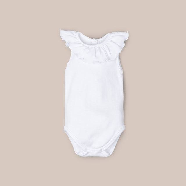 Corps intérieur en coton sans manches pour bébés, avec détail de col volant et fermeture arrière et inférieure pour faciliter le changement.