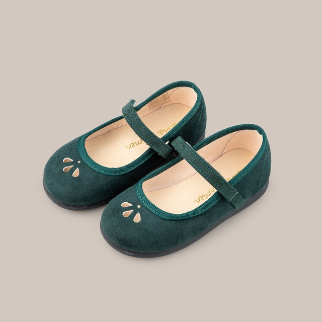 Merceditas pour fille confectionnées dans un doux matériau textile bordé d'un liseré ton sur ton et avec un détail ajouré à l'avant. Elles se ferment sur le cou-de-pied avec une bride auto-agrippante.