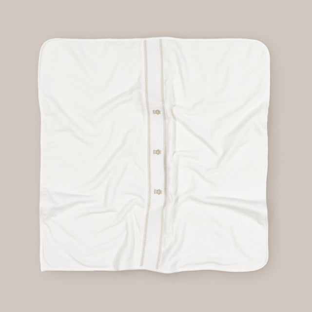 Cette couverture pour bébé avec des détails ajourés allie fonctionnalité et style, offrant une solution pratique et réconfortante pour garder le nouveau-né au chaud et à l'aise.