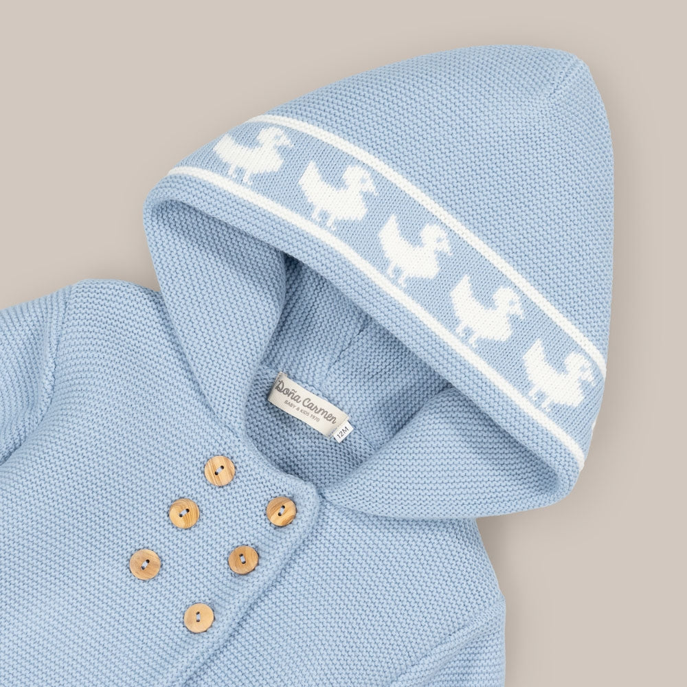 La veste, en doux tricot, présente une capuche ornée d'une délicate bordure qui ajoute une touche de charme et d'élégance.