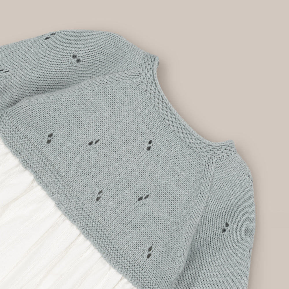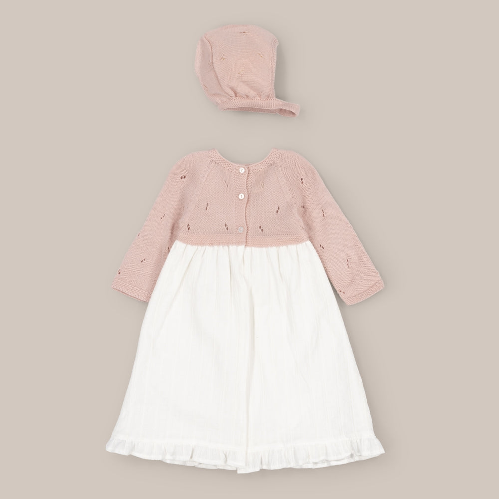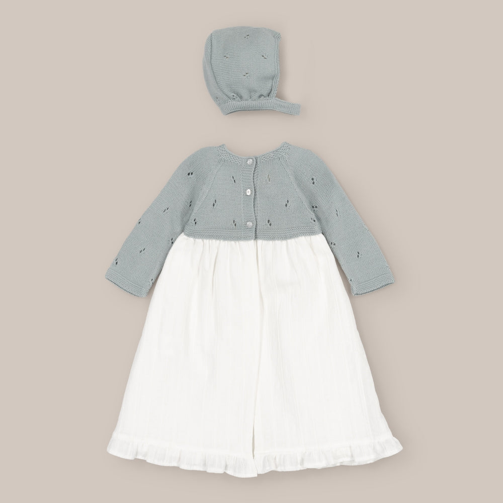 Pour faciliter l'enfilage et le retrait de la robe, elle dispose d'une fermeture à boutons à l'arrière. Ce détail pratique non seulement accélère le processus d'habillage du bébé, mais garantit également un ajustement sûr.
