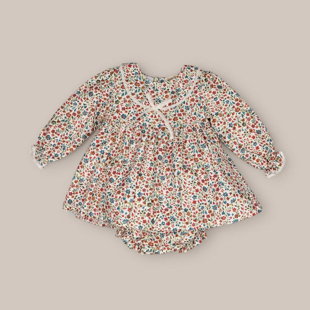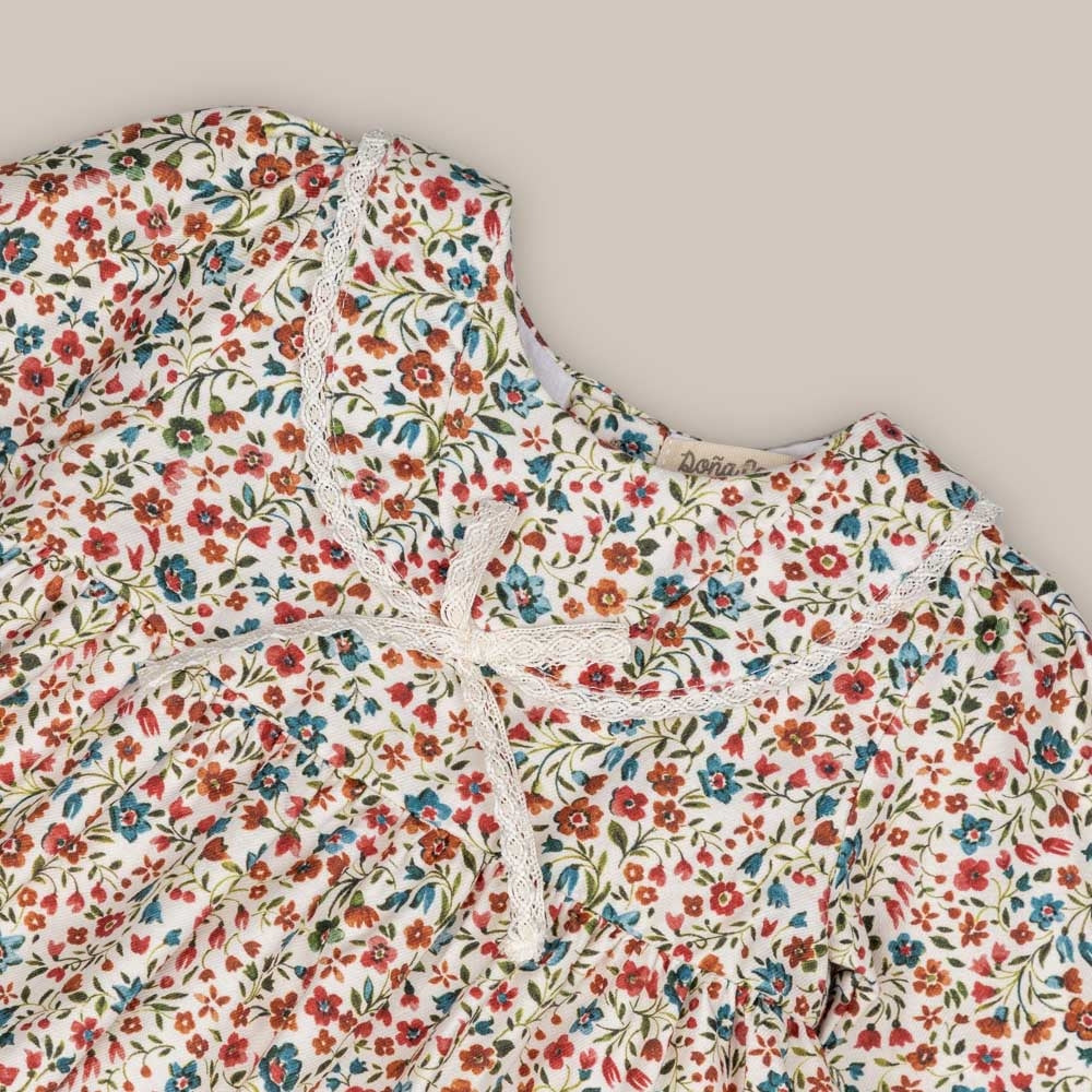 Robe pour fille en tissu fleuri. Avec son col marin et son nœud, c'est le cadeau parfait. Il a une fermeture au dos et un short assorti avec taille et jambes élastiques. Plus d'articles de la collection disponibles pour les sœurs