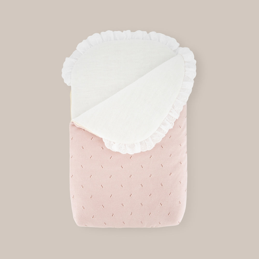 Sac en tricot ajouré pour bébé en fibre acrylique de haute qualité, avec détail de dentelle et fermeture éclair latérale.