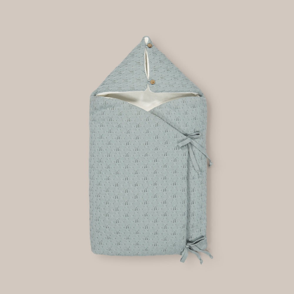 Sac en maille avec détails ajourés pour bébé en fibre acrylique de haute qualité, avec détail de capuche et fermeture par lien latéral.