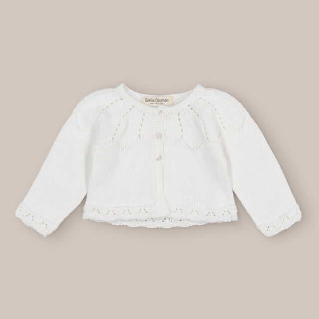 Veste en tricot pour bébé avec des détails ajourés et des boutons en nacre à l'avant.