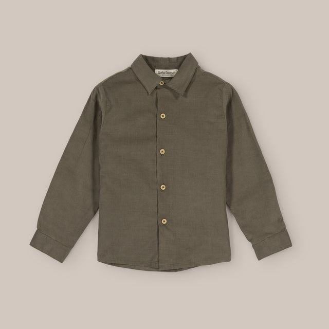 Una camisa para niño de manga larga en un precioso verde de temporada, con cuello clásico y botones de madera tanto al frente como en los puños. Ideal para quienes buscan camisas de vestir o casuales con ese toque especial que combina con todo.