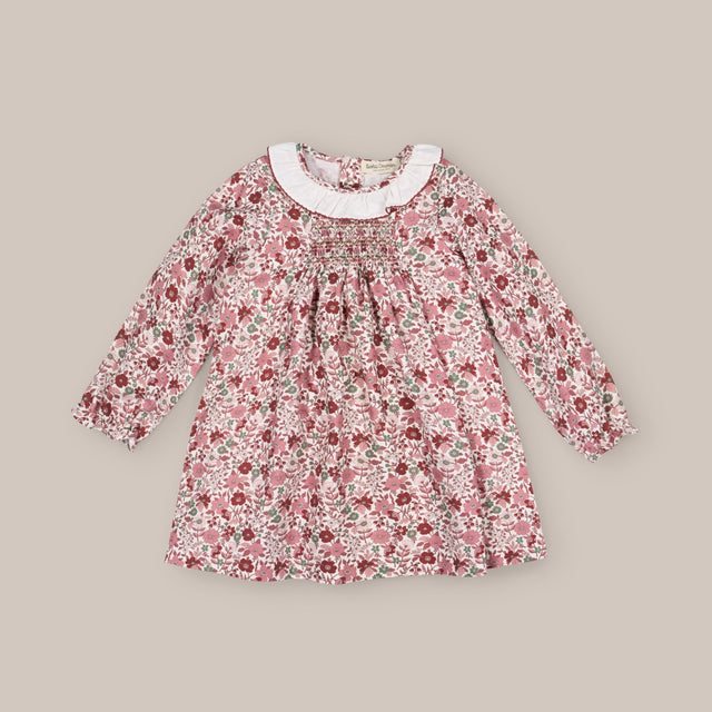 Su diseño artesanal destaca por el detalle smock en el pecho, que aporta un toque tradicional, y por el cuello volante rematado al tono, que añade dulzura y distinción.