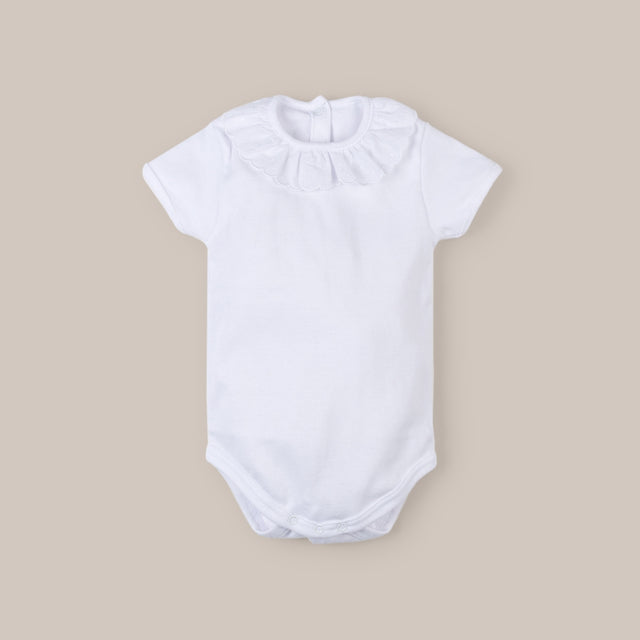 Body 100% algodón de manga corta con cierre trasero e inferior y detalle de cuello volante de plumeti.