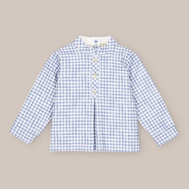 Esta camisa para niño de manga larga, en tela vichy y con cuello mao, es perfecta para cualquier ocasión. Tiene un punto elegante pero sigue siendo cómoda y práctica, con botones decorativos y cierre trasero para que vestirle sea fácil.