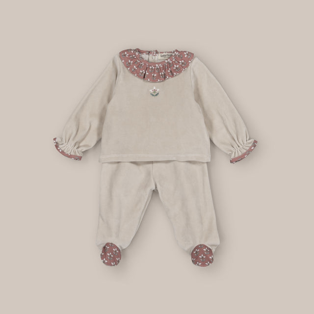 Este adorable conjunto para bebé está confeccionado en suave terciopelo, perfecto para mantener al pequeño abrigado durante los meses más fríos. El set incluye un jersey con delicado bordado central, cuello volante en tela floral a juego con los remates y cierre trasero para facilitar el cambio. Se completa con una polaina con pie cubierto, que protege los pies del bebé y proporciona una cobertura extra en las piernas, asegurando confort y calidez.