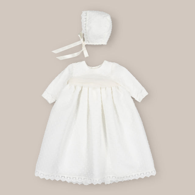 Diseñado para ocasiones especiales,éste elegante traje de bebé está confeccionado en tela plumeti, que añade un toque clásico y delicado. la cintura está adornada con un lazo de tul, que no solo agrega un elemento decorativo sino que también realza la dulzura del conjunto.