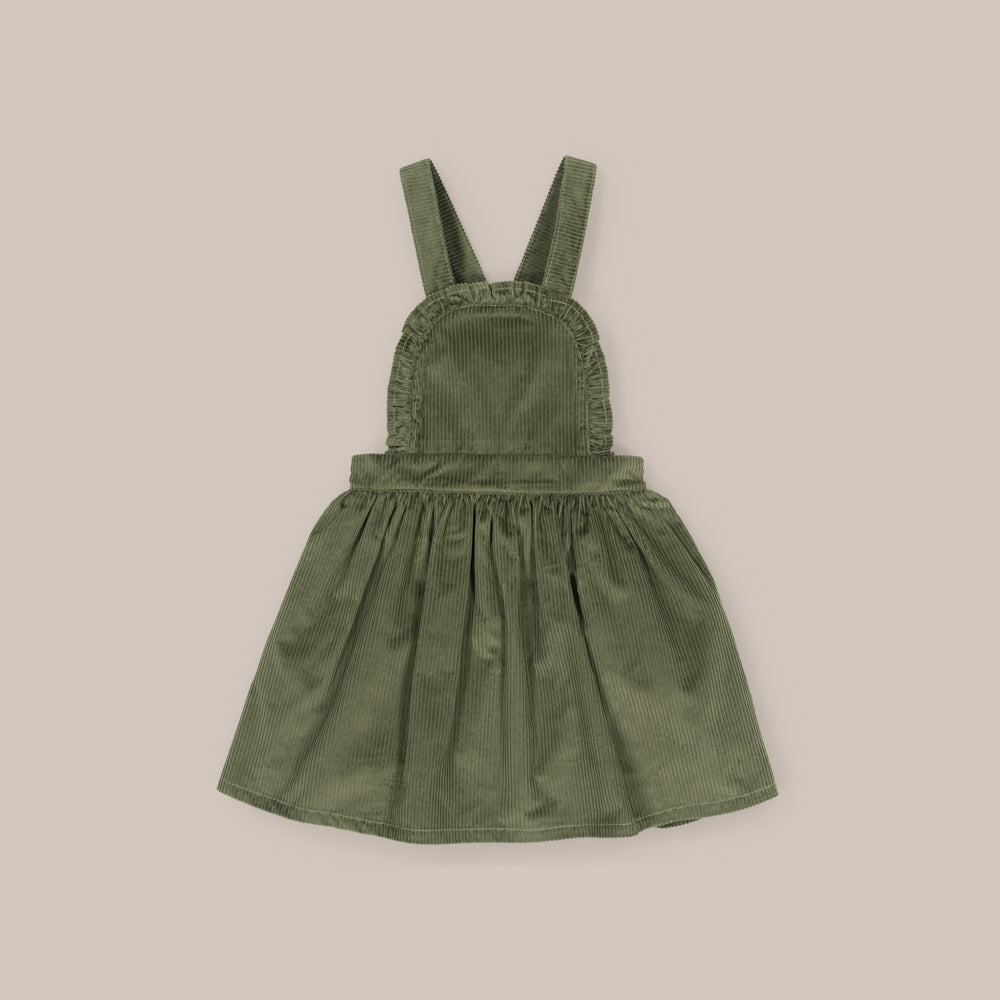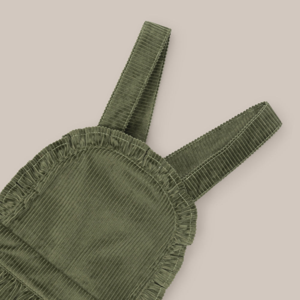 Esse pinafore Para uma garota com design clássico e atemporal, ele tem uma pilhagem no peito, adicionando um toque divertido e feminino ao design. As tiras se cruzam nas costas e amarradas com botões, proporcionando conforto ao se vestir e se despir.