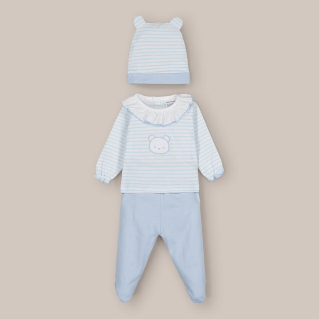 Este conjunto incluye diversas prendas diseñadas específicamente para adaptarse a las necesidades de los recién nacidos: camiseta de manga larga con dibujo central y detalles cuidadosamente pensados, leggins para proteger los pies del bebé, que proporcionan cobertura adicional a las piernas del bebé, manteniéndolas abrigadas y cómodas.