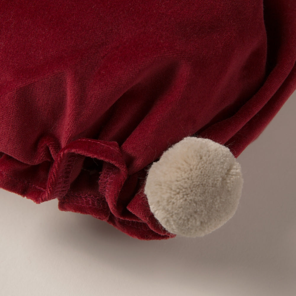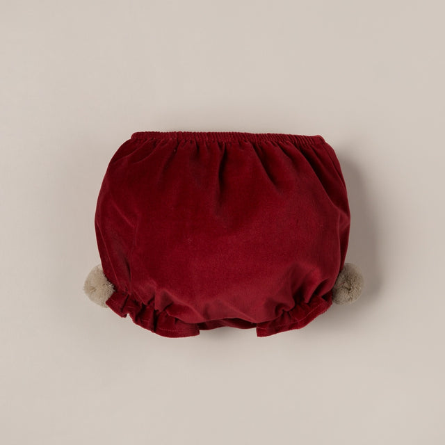Preciosa Tapa-fraldas de veludo em tom granada. Está decorada com dois pompons laterais. Conta com elástico na cintura e nas pernas para uma melhor fixação. Combina-a com o resto da coleção ter para criar conjuntos de irmãos.