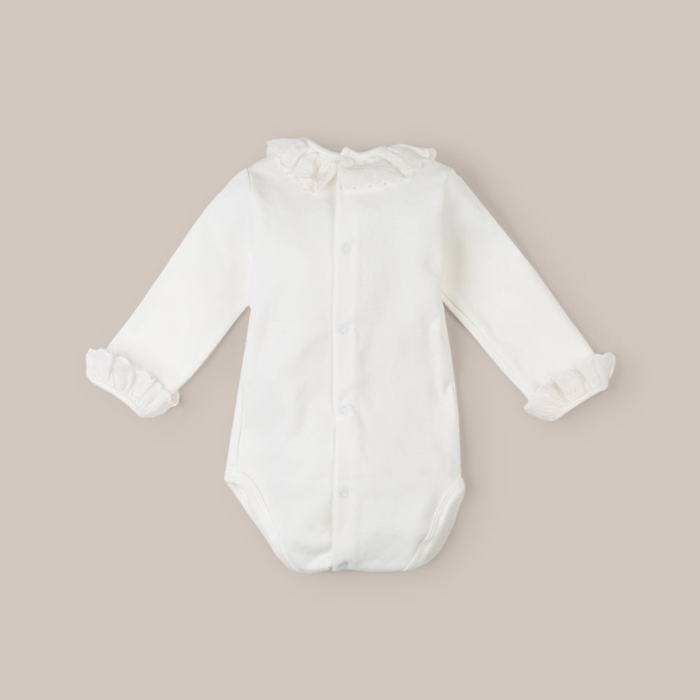 Corpo interior 100% de algodão de manga longa para bebês. Com detalhes do volante Plumeti no pescoço e punhos.